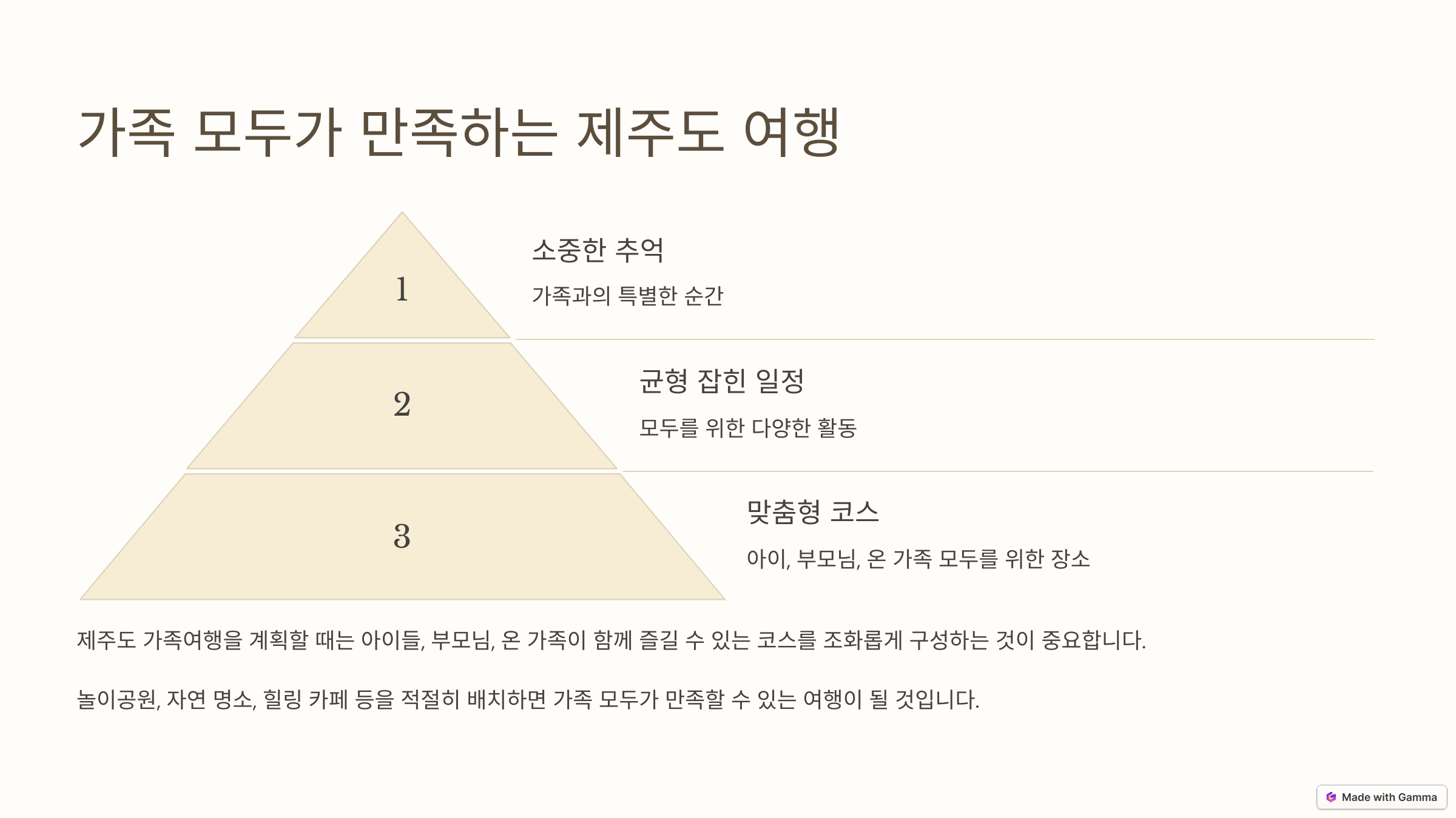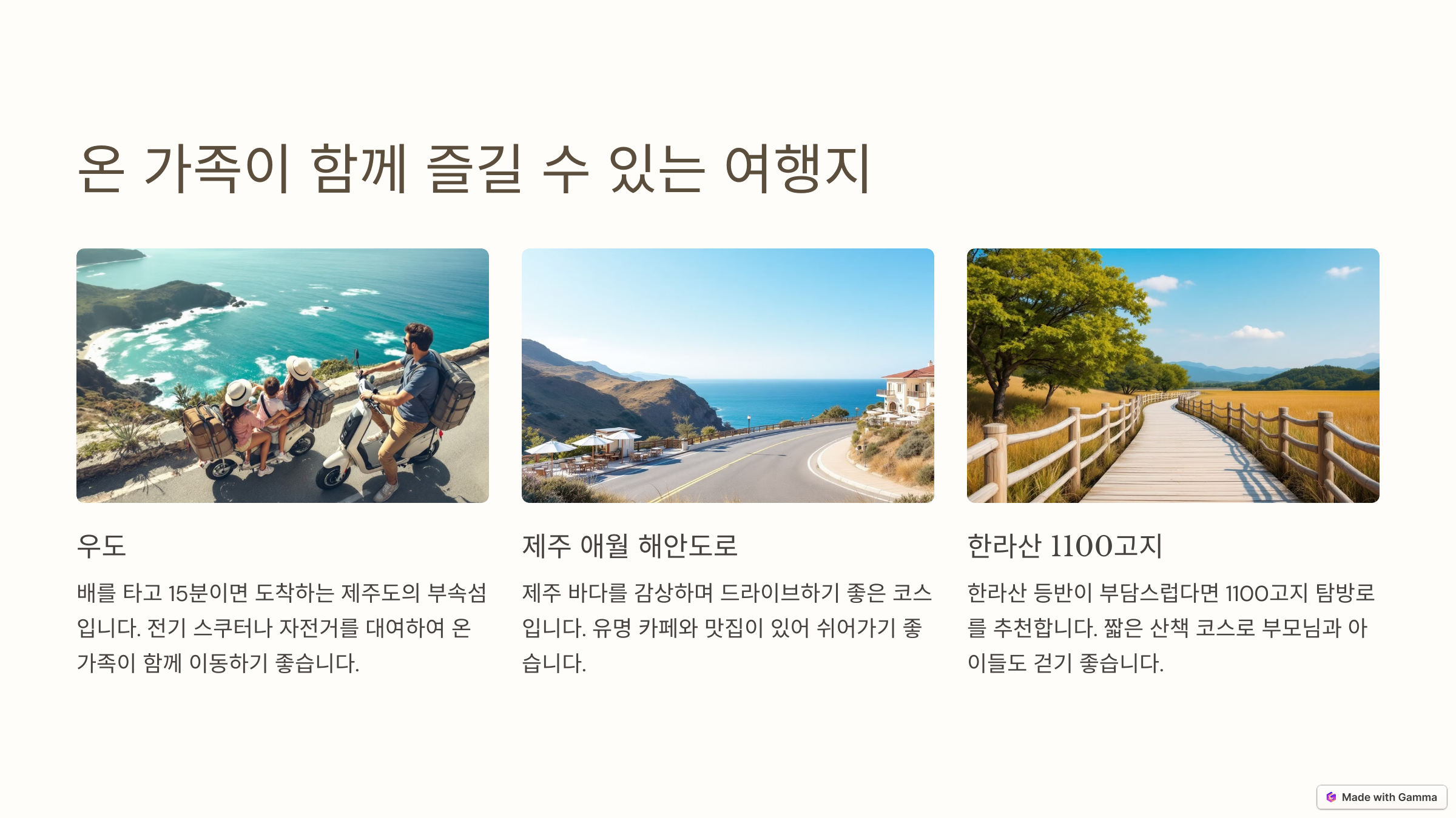 제주도 가족여행을 계획할 때는 아이들, 부모님, 온 가족이 함께 즐길 수 있는 코스를 조화롭게 구성하는 것이 중요합니다. 놀이공원, 자연 명소, 힐링 카페 등을 적절히 배치하면 가족 모두가 만족할 수 있는 여행이 될 것입니다. 이번 여행을 통해 가족과 소중한 추억을 만들어보세요!