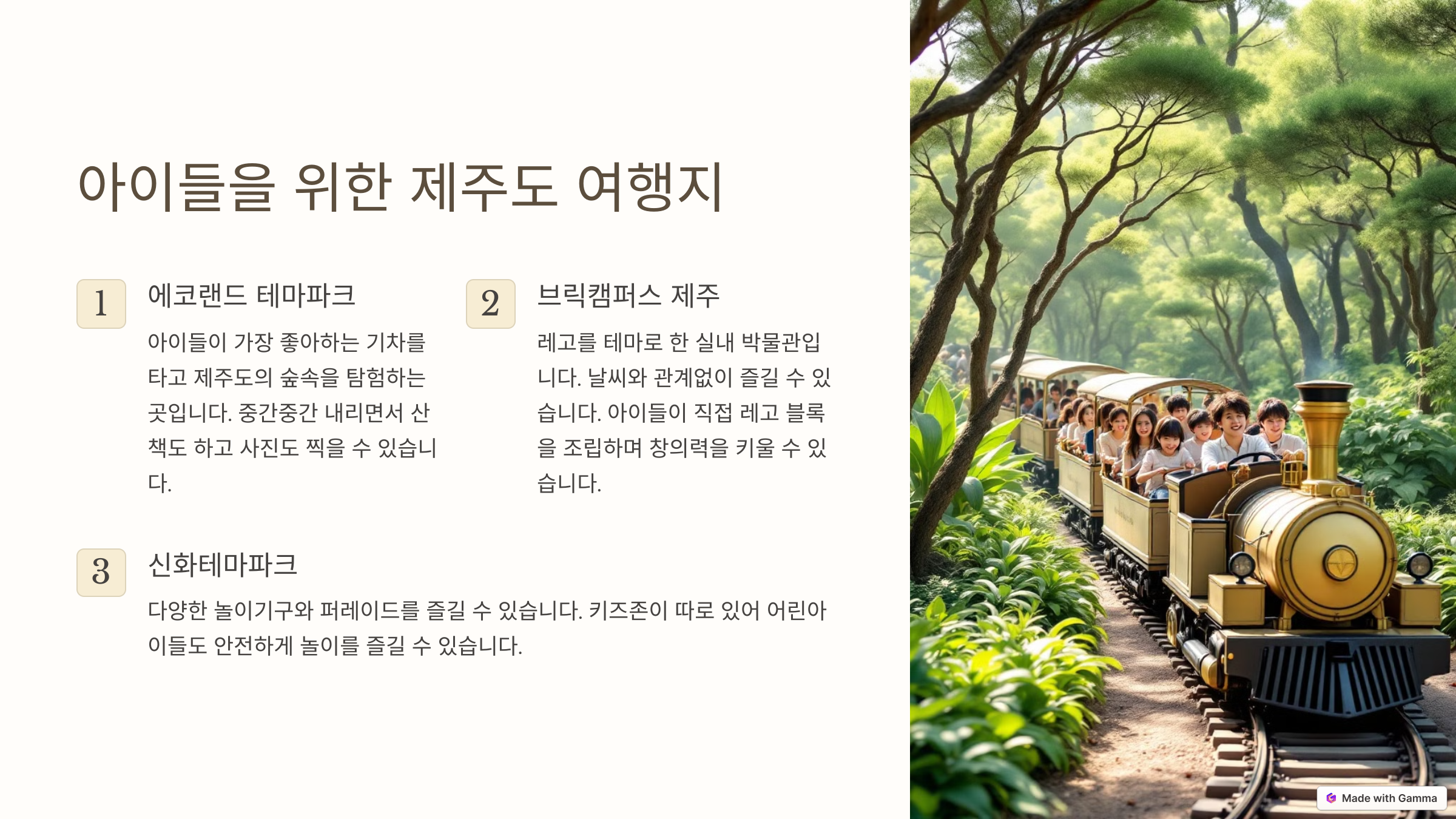 - 아이들이 가장 좋아하는 기차를 타고 제주도의 숲속을 탐험하는 곳입니다.