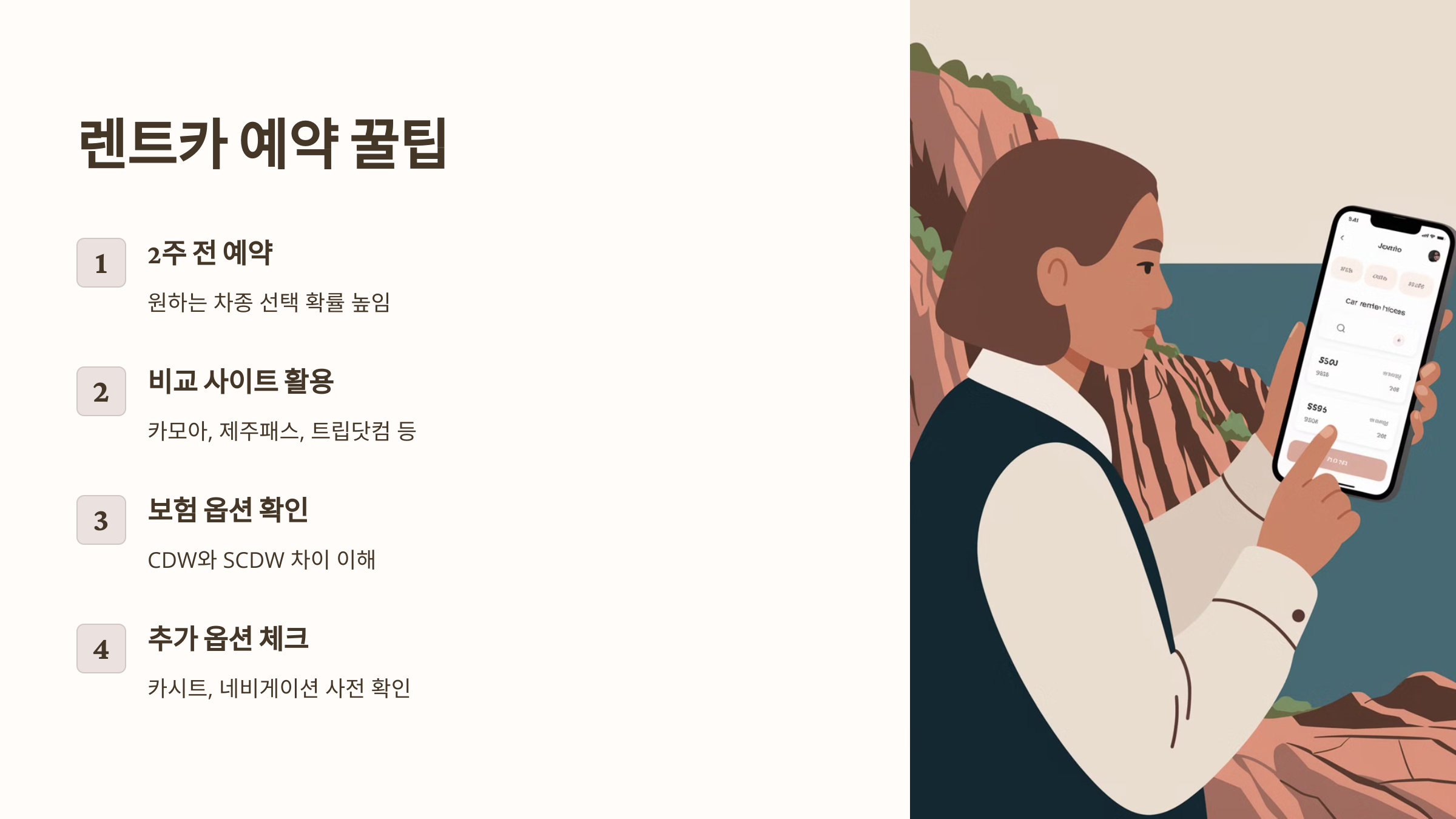 렌트카 이용 시 가장 중요한 것은 보험 옵션입니다. 일반 자차보험(CDW)과 고급 자차보험(SCDW)의 차이를 이해하고, 자신의 운전 스타일에 맞는 보험을 선택하세요. 일반적으로 5,000원~15,000원 추가 비용으로 자기부담금을 크게 줄일 수 있습니다.