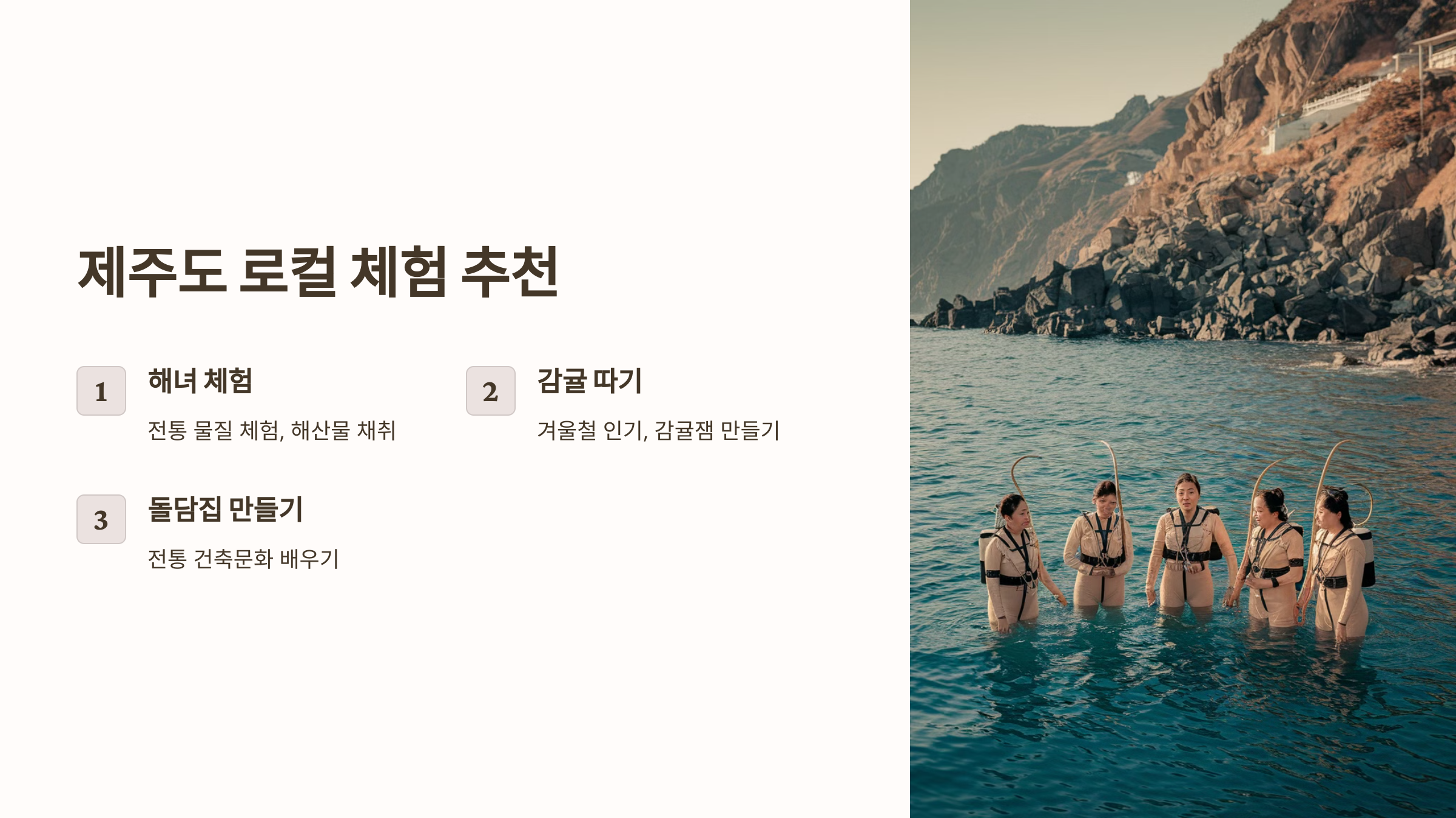 제주도를 방문할 때 유명 관광지만 둘러보는 것이 아니라, 제주만의 독특한 전통과 문화를 직접 체험해 보는 것도 특별한 경험이 될 수 있다. 해녀 체험, 감귤 따기, 돌담 쌓기 같은 로컬 체험과 성읍민속마을, 하도리 마을처럼 전통이 살아있는 곳을 방문하면 **제주의 진짜 매력을 느낄 수 있다.**