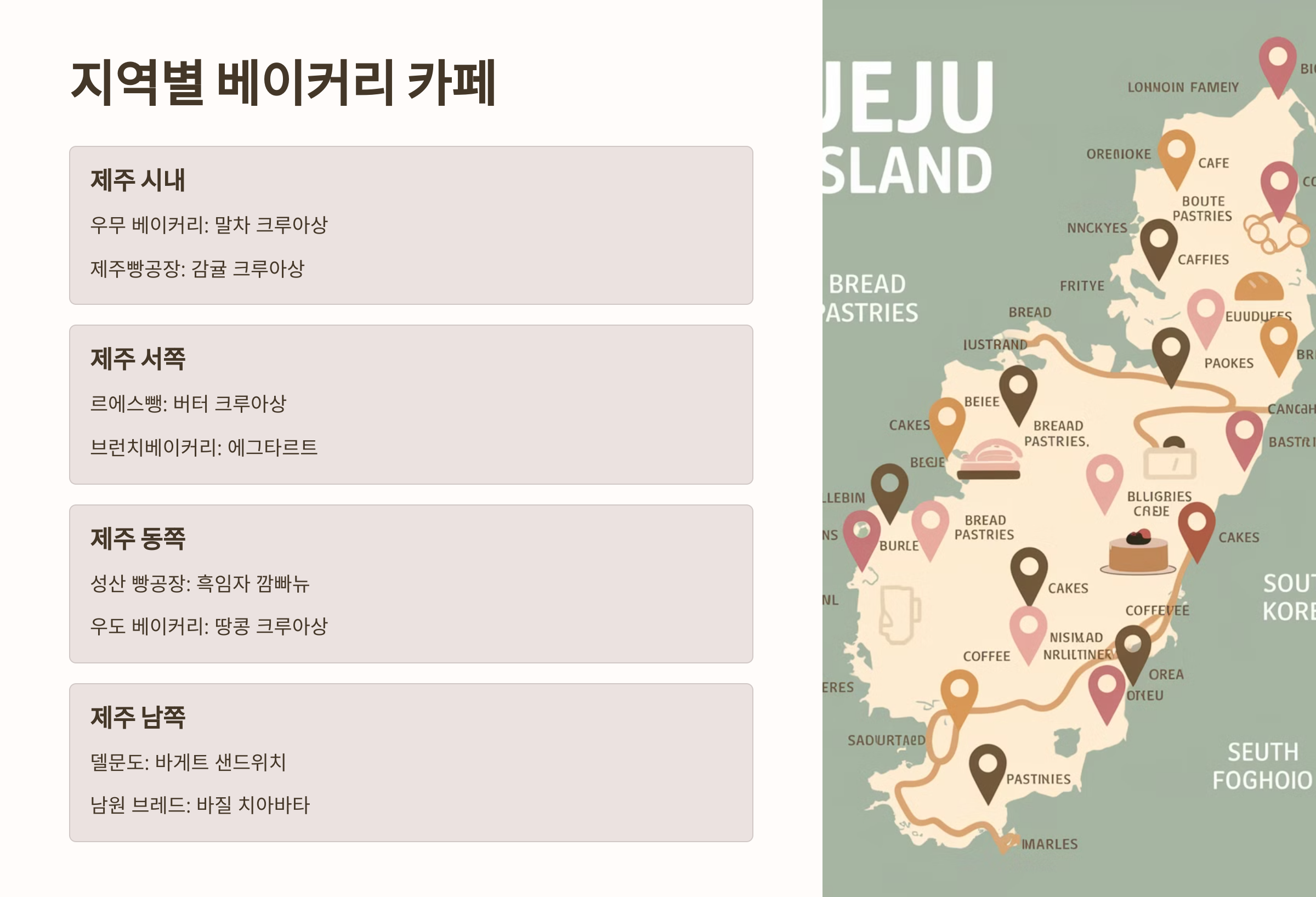 제주도 베이커리 카페는 지역별로 특색이 다르며, 감귤, 한라봉, 우도 땅콩 등 **제주 특산물을 활용한 빵이 많아** 방문할 가치가 충분하다.