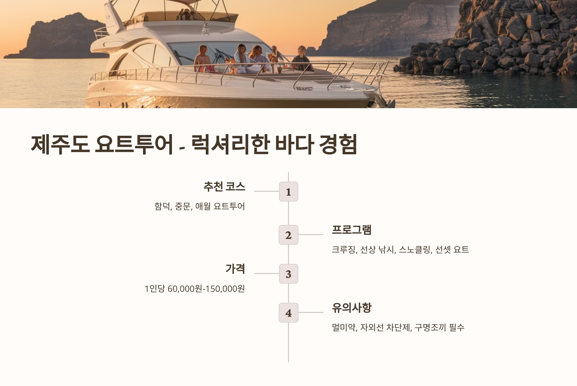 - 크루징 투어: 제주의 해안선을 따라 요트로 이동하며 경치 감상