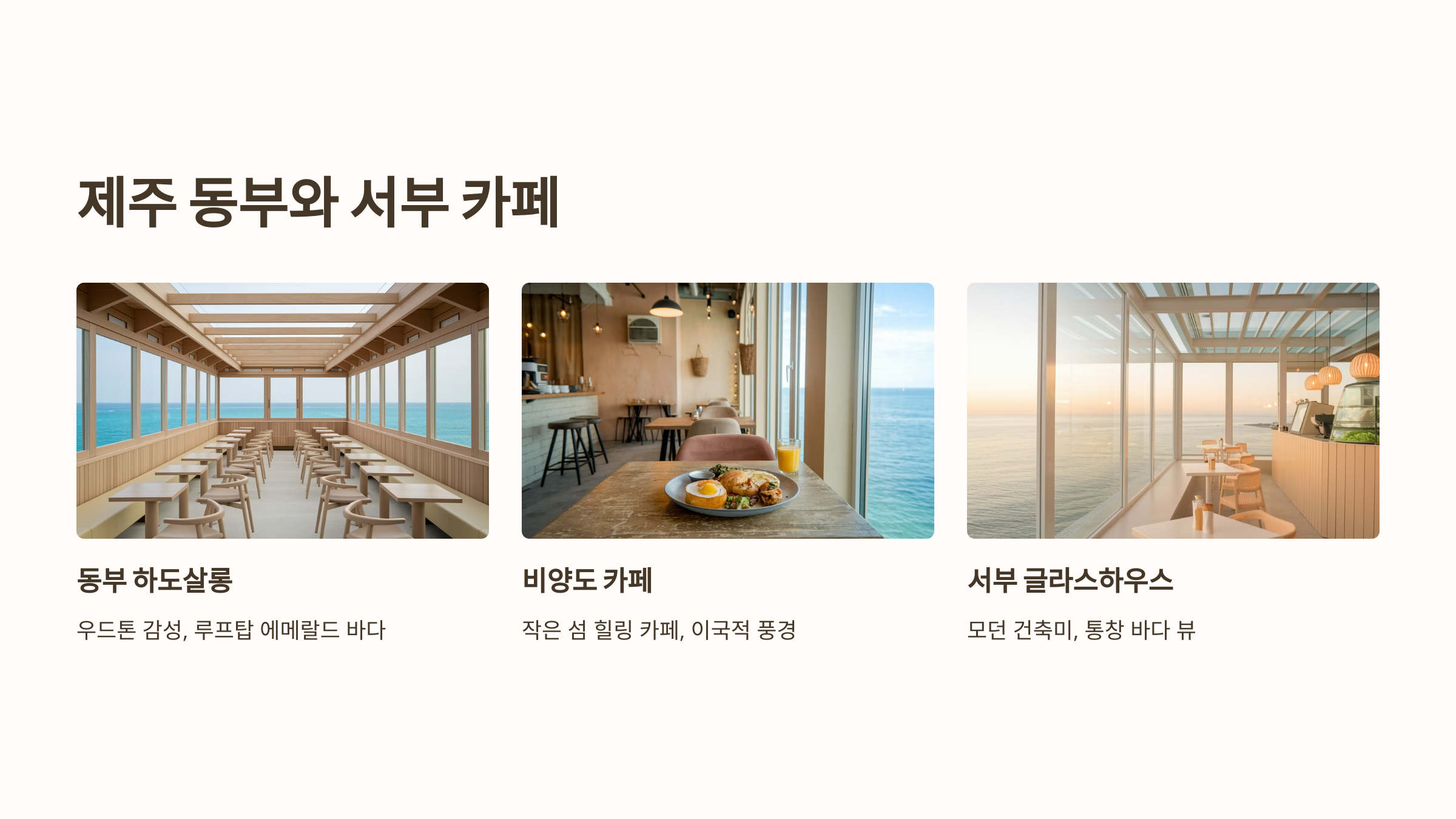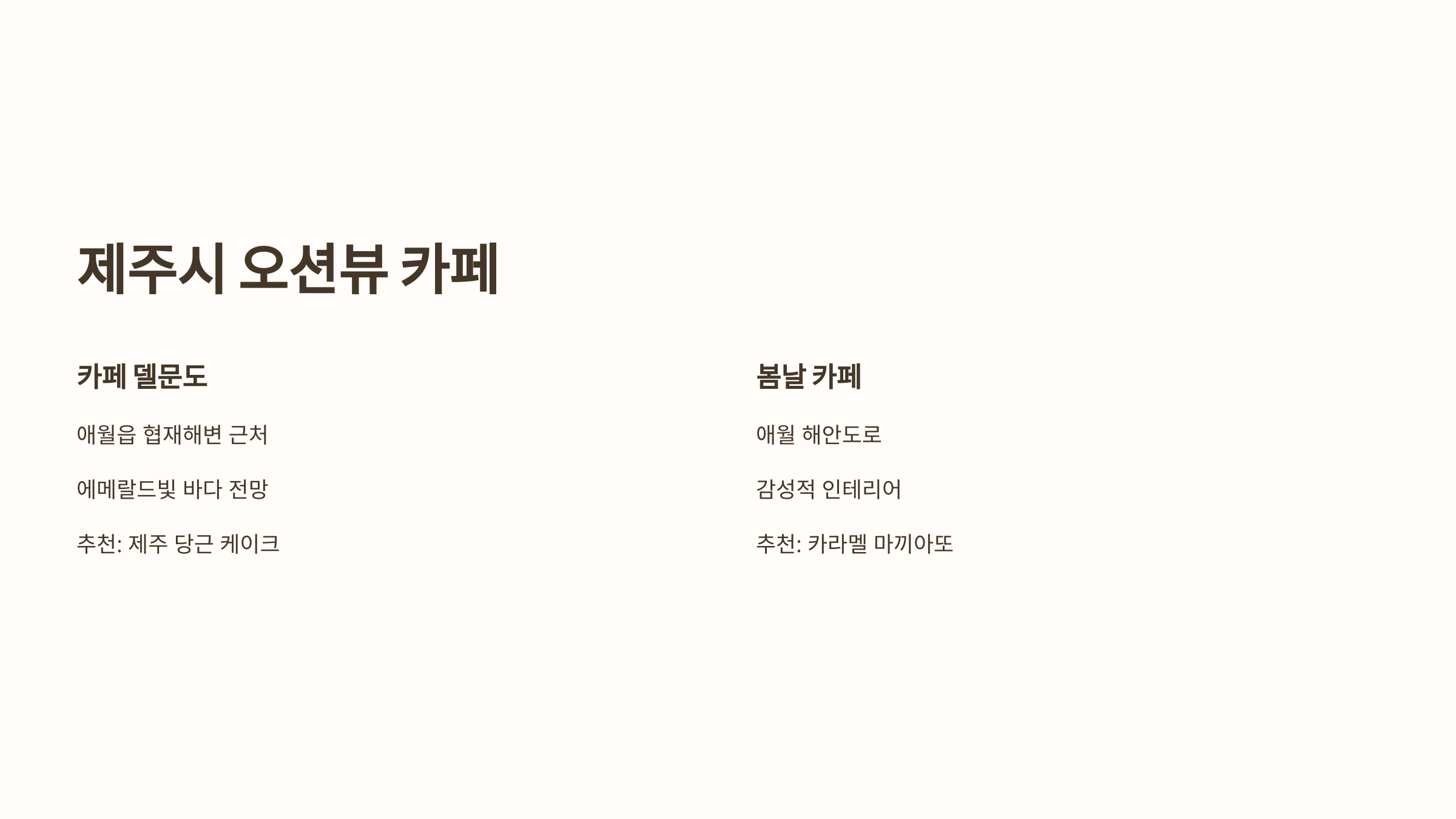 제주도에는 SNS에서 핫한 오션뷰 카페가 많아, 여행의 필수 코스로 자리 잡고 있습니다. 애월, 협재, 서귀포, 중문, 동부권 등 지역별로 매력이 다르기 때문에 여행 일정에 맞춰 방문해 보세요. 이번 제주도 여행에서는 탁 트인바다 전망과 함께 감성적인 카페 투어를 즐겨보세요!