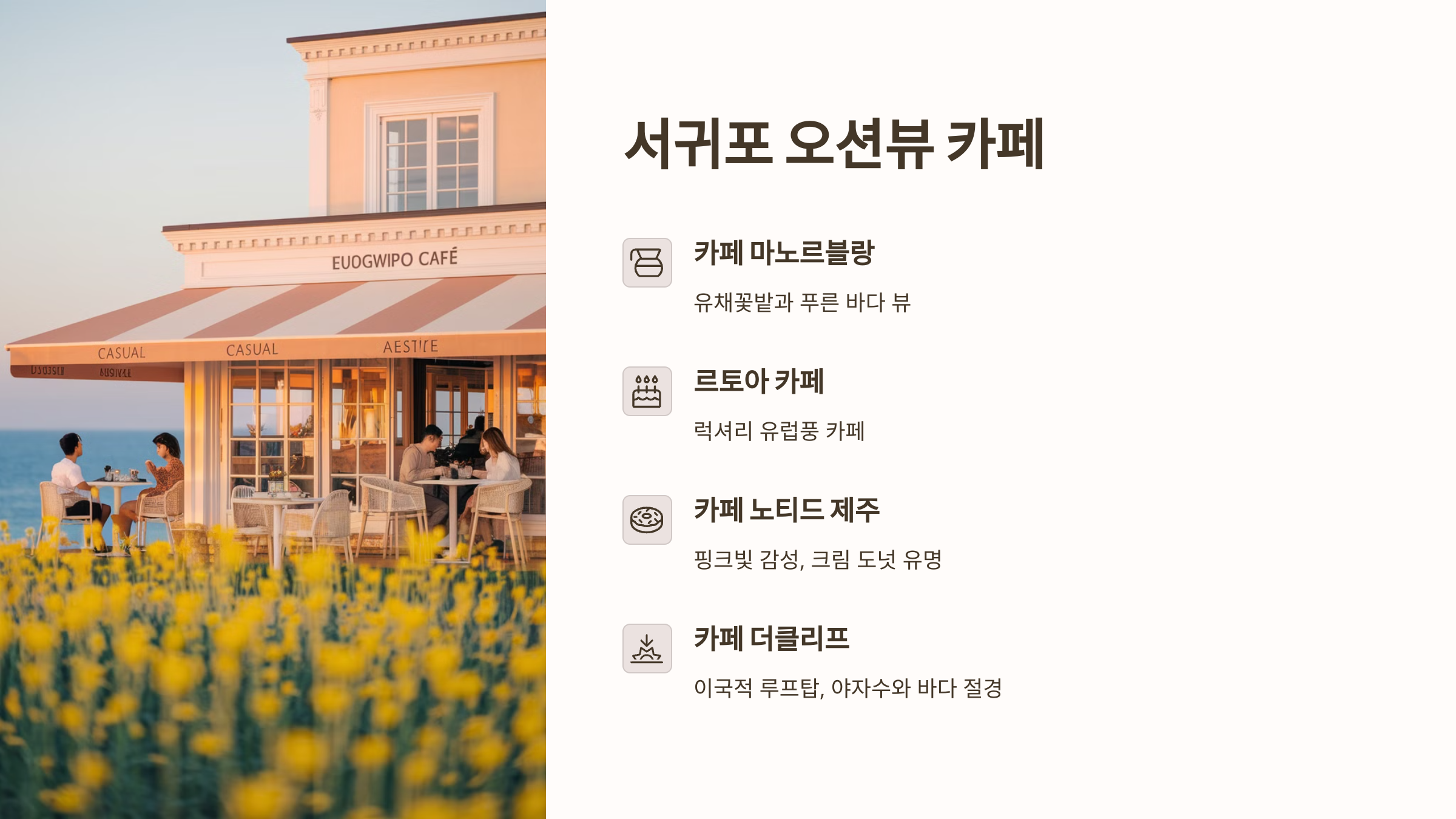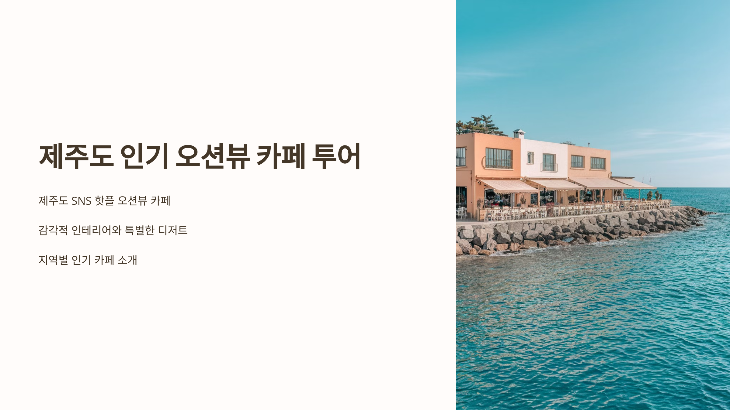 제주도는 아름다운 바다를 배경으로 한 감성적인 오션뷰 카페가 많아 SNS에서 인기가 많습니다. 특히 2024년 현재 제주도에서 핫한 오션뷰 카페는 감각적인 인테리어와 특별한 디저트로 여행객들의 발길을 사로잡고 있습니다. 본 글에서는 제주도 지역별 SNS 인기 오션뷰 카페를 소개합니다. 제주 여행을 계획하고 있다면 이 리스트를 참고하여 감성 가득한 카페 투어를 즐겨보세요!