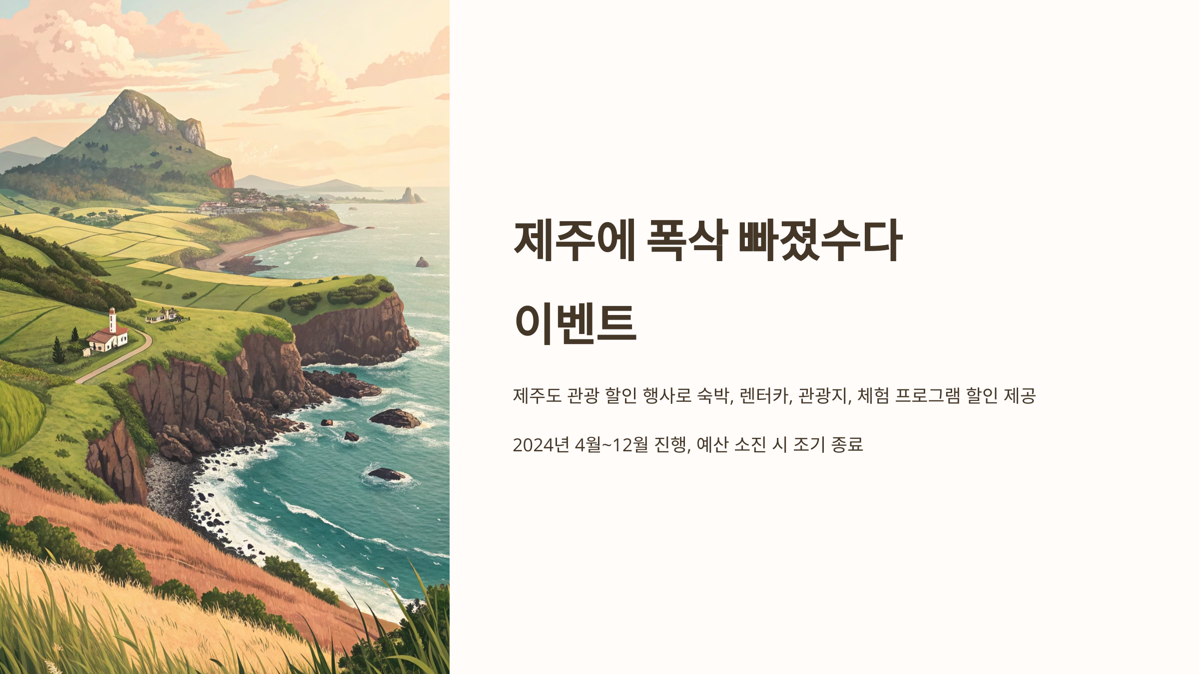 제주 여행을 더욱 저렴하게 즐길 수 있는 ‘제주에 폭삭 빠졌수다’ 이벤트는 **최대 50%까지 숙박, 렌터카, 관광지를 할인받을 수 있는 기회**다. 사전 예약만 하면 **제주도의 인기 관광지와 체험 프로그램을 합리적인 가격에 즐길 수 있으며, 여행 경비를 절약할 수 있는 최고의 방법**이다.