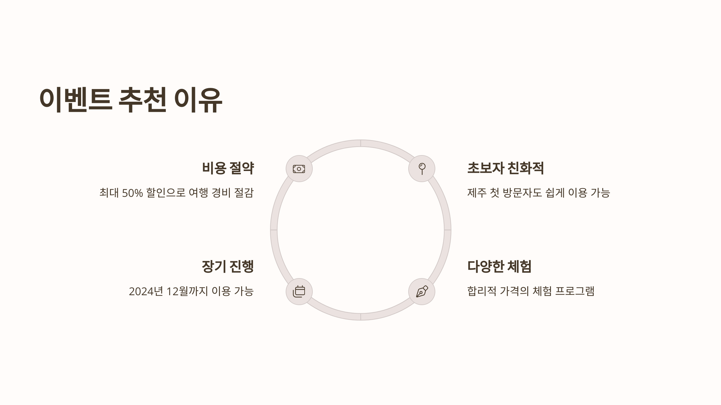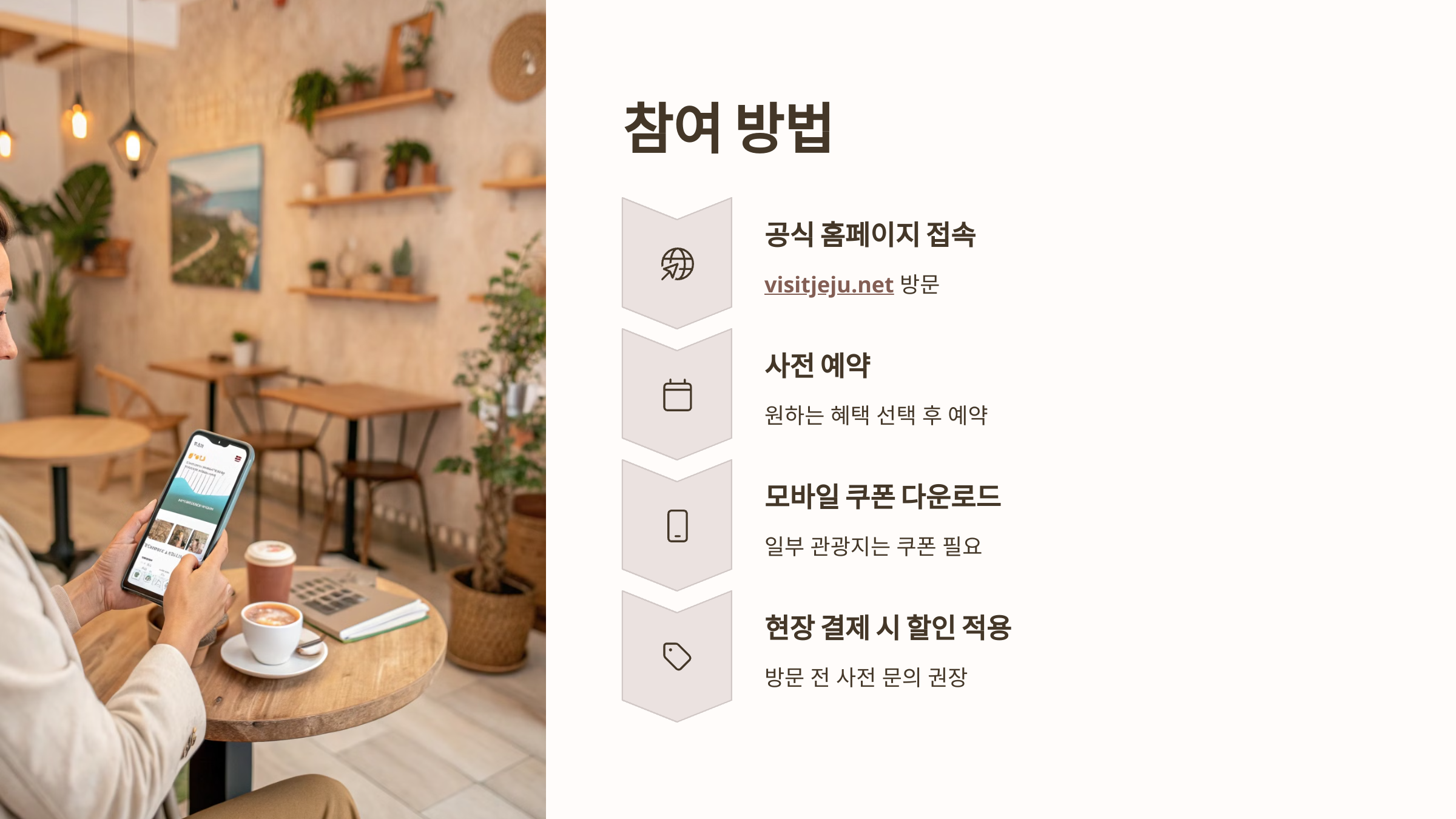 할인 혜택을 받기 위해서는 **제주관광공사 공식 홈페이지에 접속하여 이벤트 페이지에서 사전 예약**을 해야 한다.