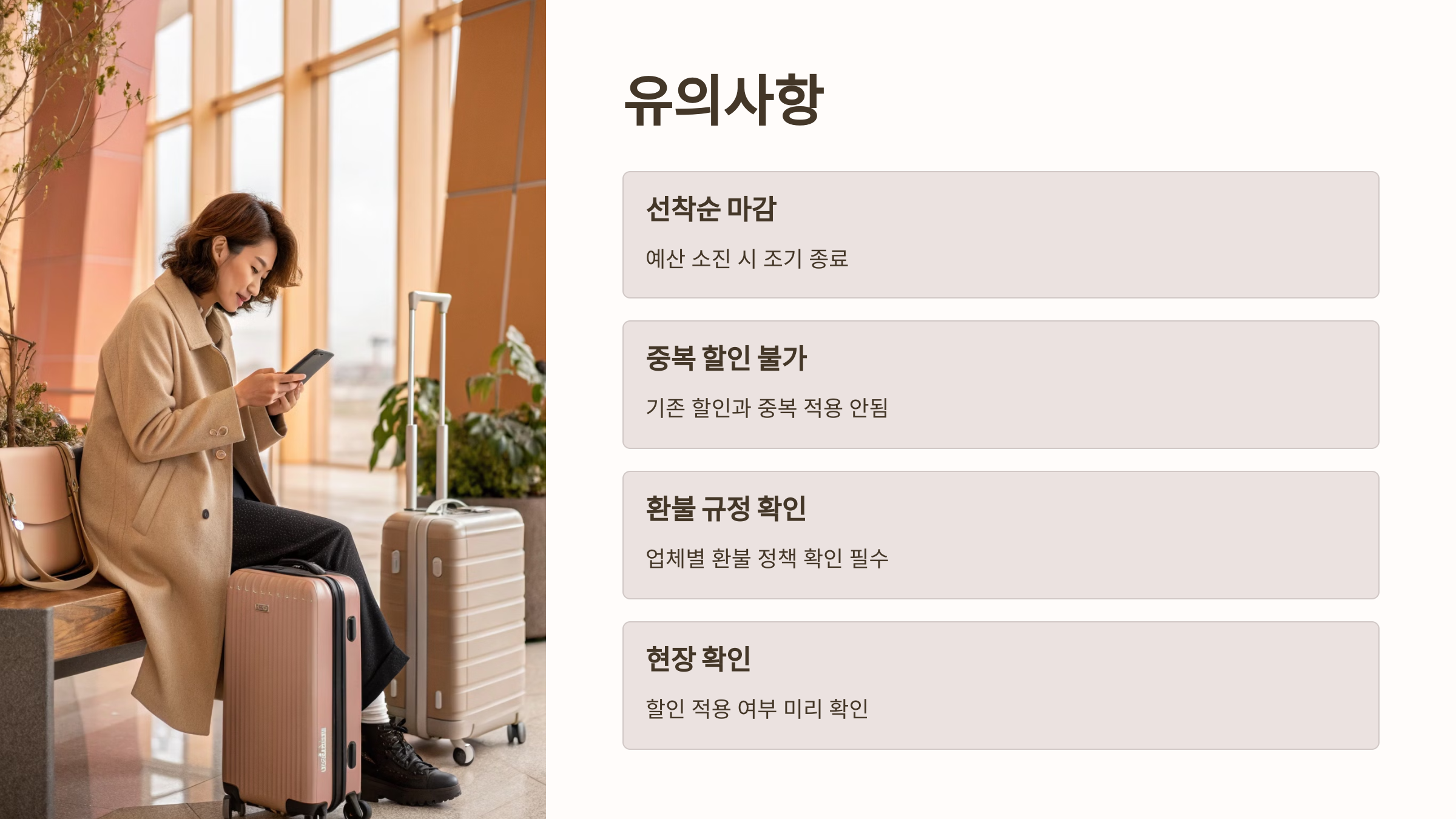 - 중복 할인 불가: 일부 숙박업소 및 렌터카 업체에서는 기존 할인과 중복 적용되지 않을 수 있음