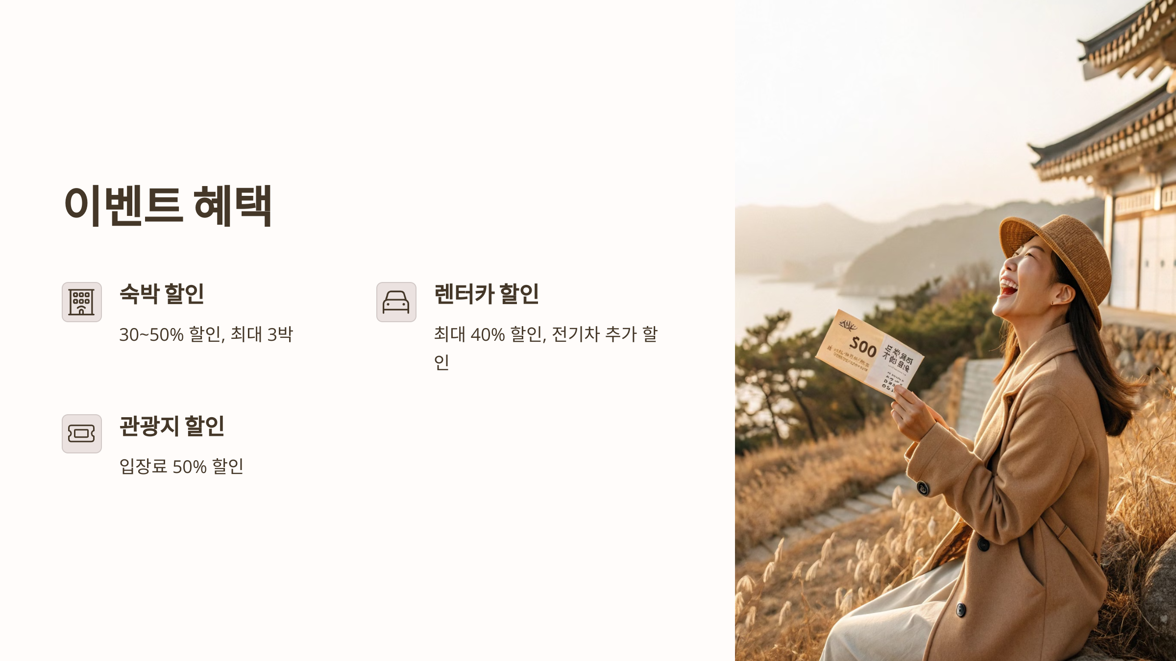 - 주요 혜택: 숙박, 렌터카, 관광지 입장료, 체험 프로그램 할인