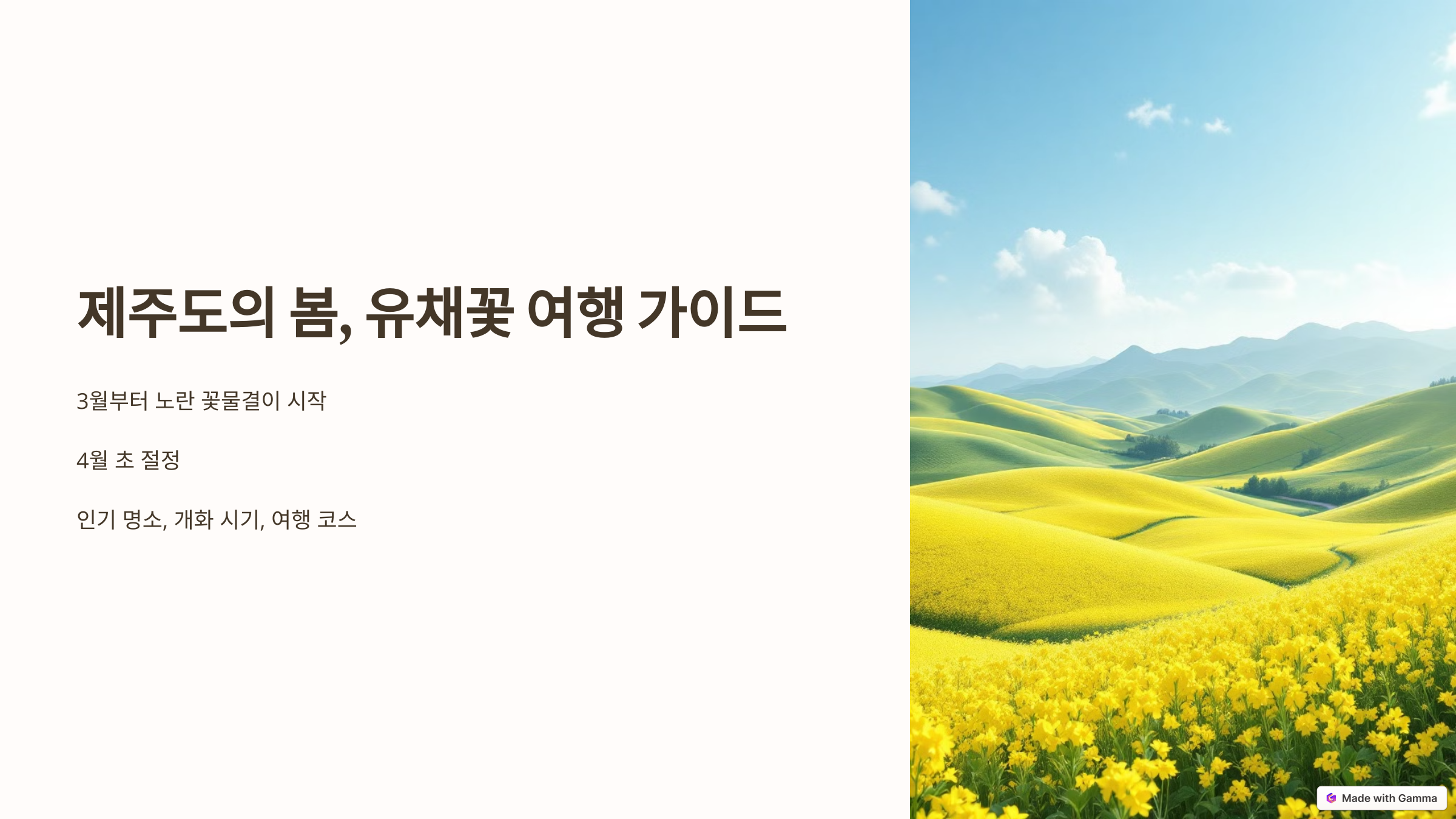 제주의 봄은 유채꽃이 피어나면서 시작됩니다. 3월부터 제주 곳곳에서 노란 꽃물이 들기 시작하며, 4월 초에는 절정을 이룹니다. 유채꽃이 만개한 도로와 들판은 제주를 더욱 화사하게 만들어 주며, 관광객들에게 잊지 못할 추억을 선사합니다. 이번 글에서는 제주에서 가장 인기 있는 유채꽃 명소를 소개하고, 개화 시기와 사진 명소, 여행 코스 추천까지 모두 정리해 드리겠습니다. 또한, 유채꽃과 관련된 제주 특산품도 함께 알려드리니 여행 시 참고해 보세요!