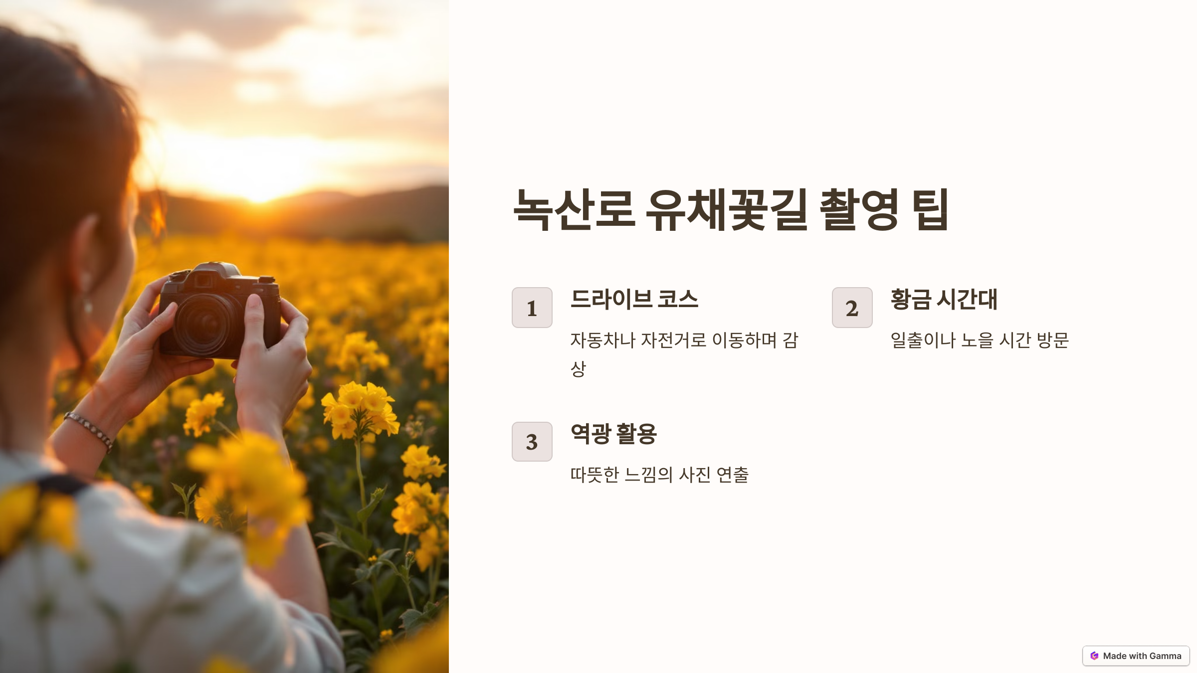 제주의 유채꽃 시즌이 시작되면서 곳곳에서 노란 꽃물결이 펼쳐지고 있습니다. 3월 말부터 4월 초까지가 절정이므로, 이 시기를 놓치지 말고 방문해 보세요. 녹산로 유채꽃길, 섭지코지, 카멜리아힐 등 제주 곳곳에서 아름다운 유채꽃을 만끽할 수 있습니다. 또한, 유채꽃 관련 특산품인 유채꿀, 유채씨유, 유채꽃차 등을 기념품으로 구매해보는 것도 좋은 여행의 추억이 될 것입니다.