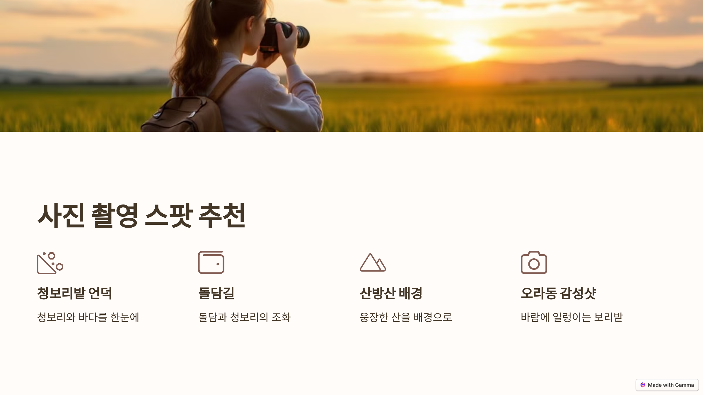 - 가파도 청보리밭 언덕: 푸른 청보리와 함께 제주 바다까지 한눈에 담을 수 있는 촬영 포인트