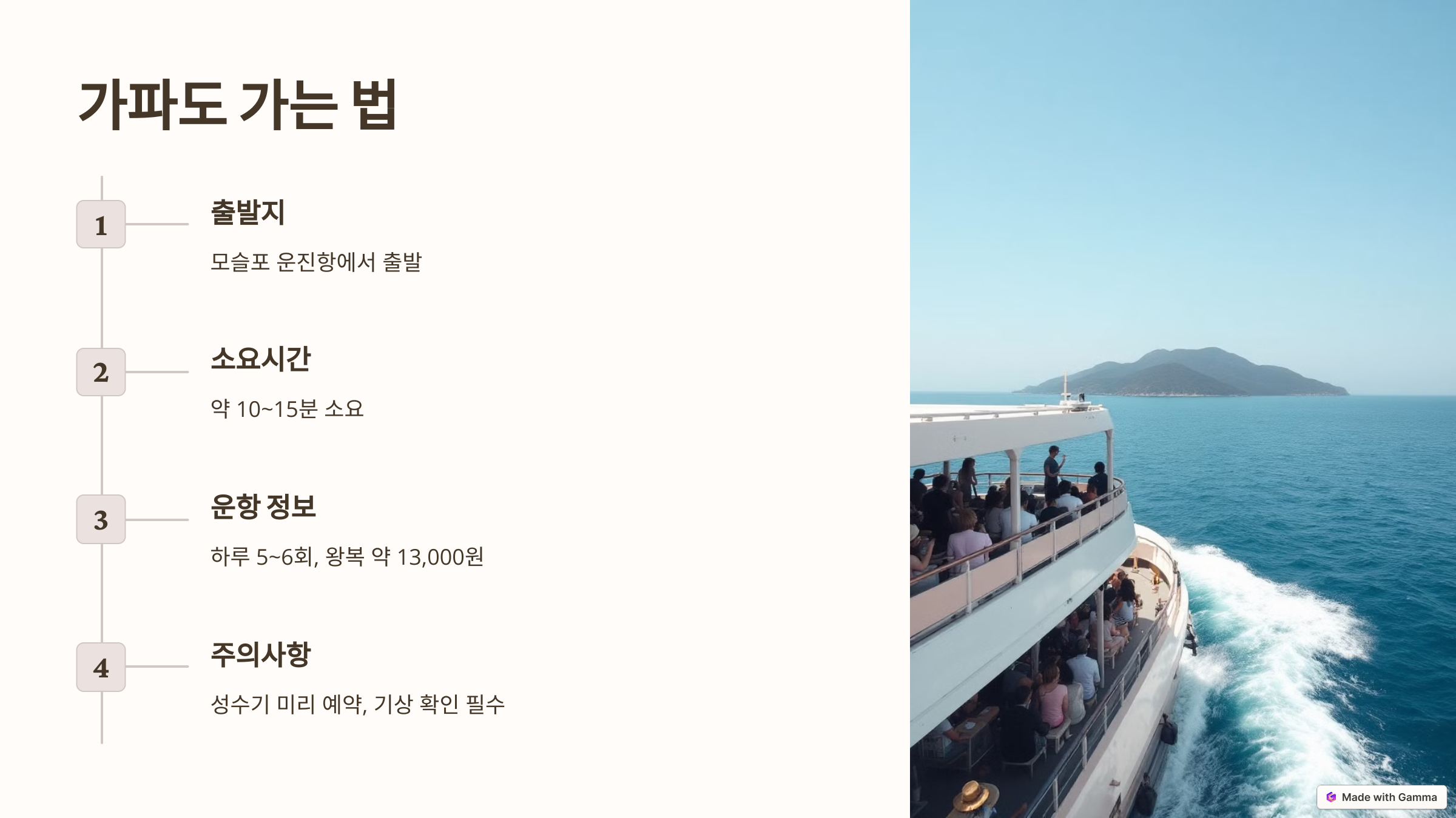 - 승선 요금: 왕복 약 13,000원 (성인 기준)