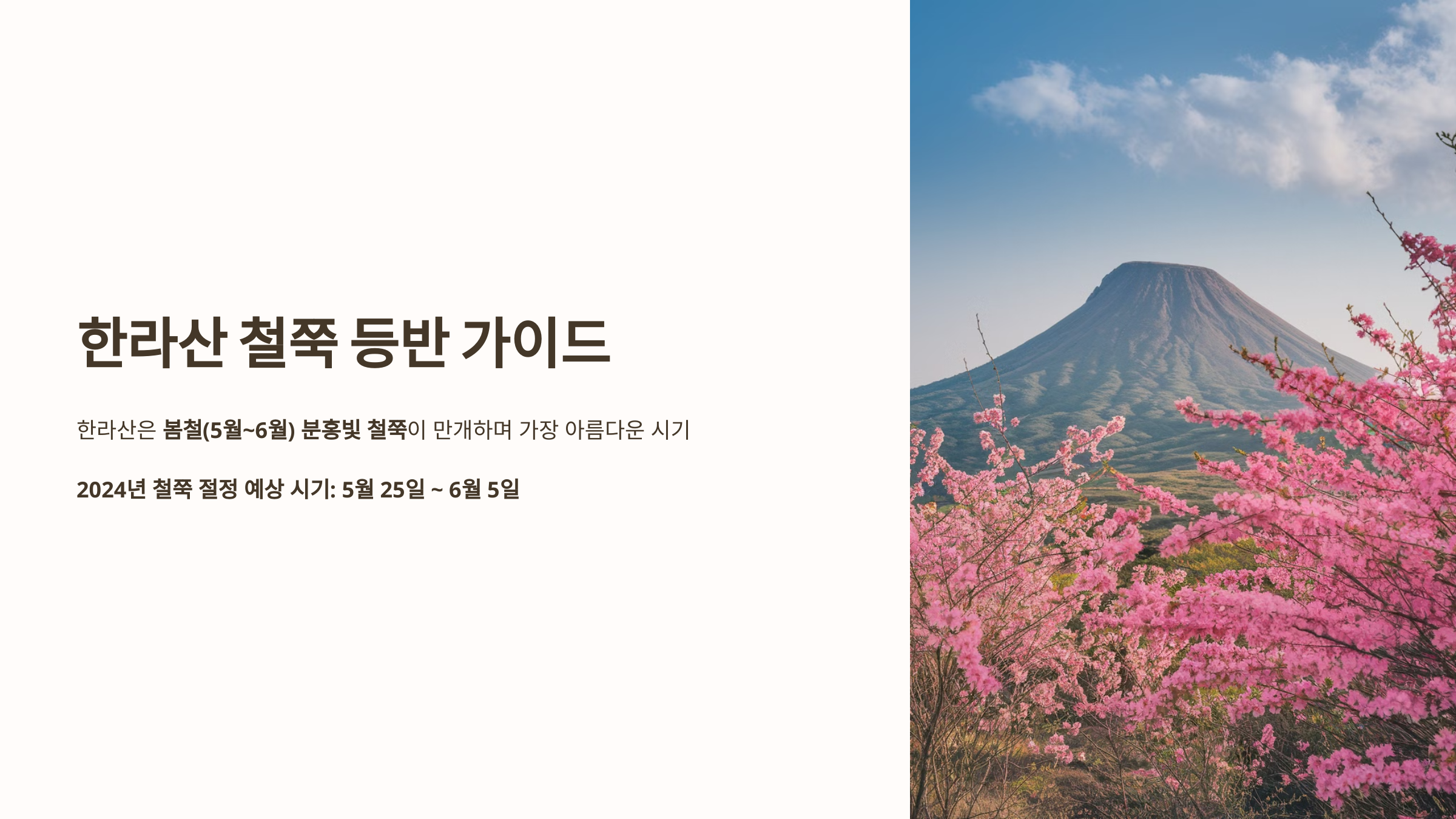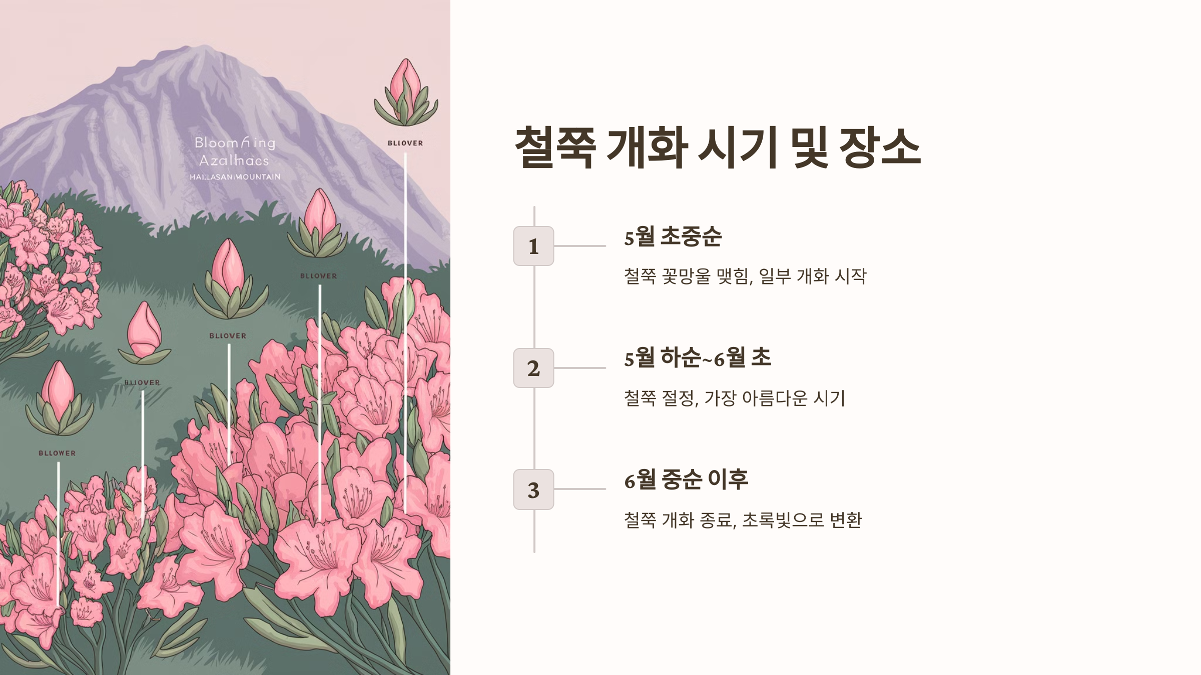 한라산 철쭉은 5월 중순부터 피기 시작해 6월 초에 절정을 이룬다. 매년 기후에 따라 개화 시기가 조금씩 변동되지만, **2024년 한라산 철쭉 절정 예상 시기는 5월 25일 ~ 6월 5일**이다.