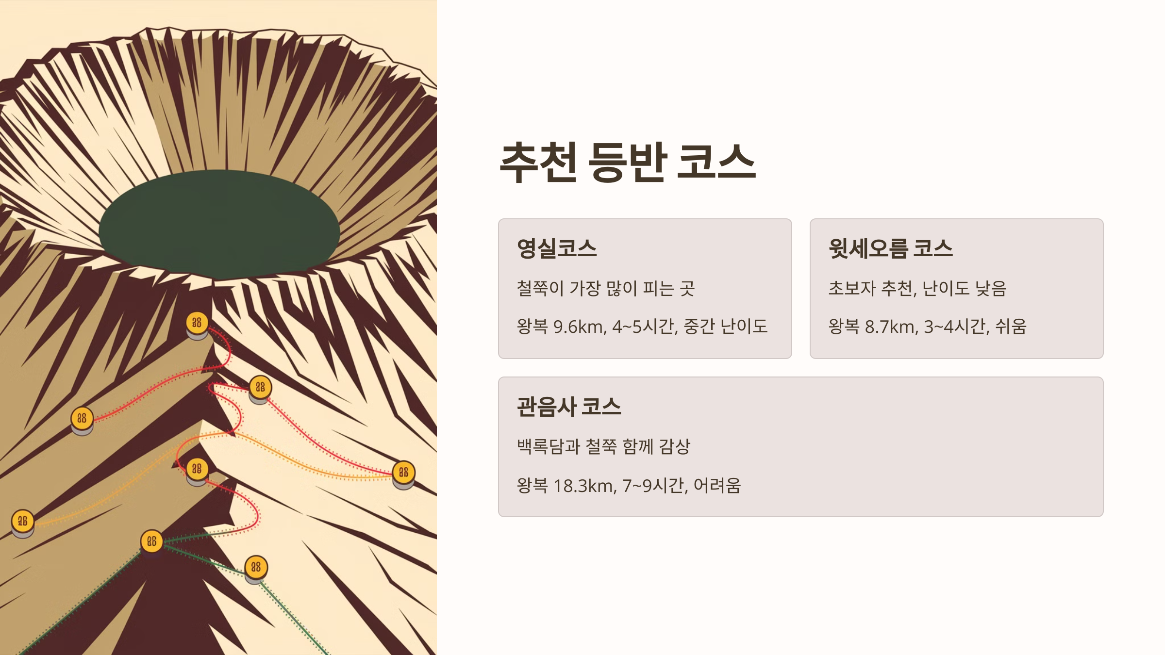 - 관음사 코스: 중급자 이상 추천, 정상 부근 철쭉 감상 가능