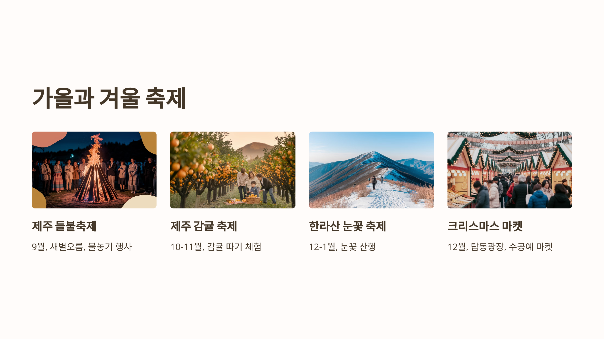제주도는 사계절 내내 다채로운 축제가 열리는 곳으로, 계절별로 색다른 매력을 경험할 수 있다. **봄에는 벚꽃과 유채꽃을, 여름에는 해양 스포츠를, 가을에는 감귤과 들불축제를, 겨울에는 눈꽃과 크리스마스 마켓을 즐길 수 있다.**