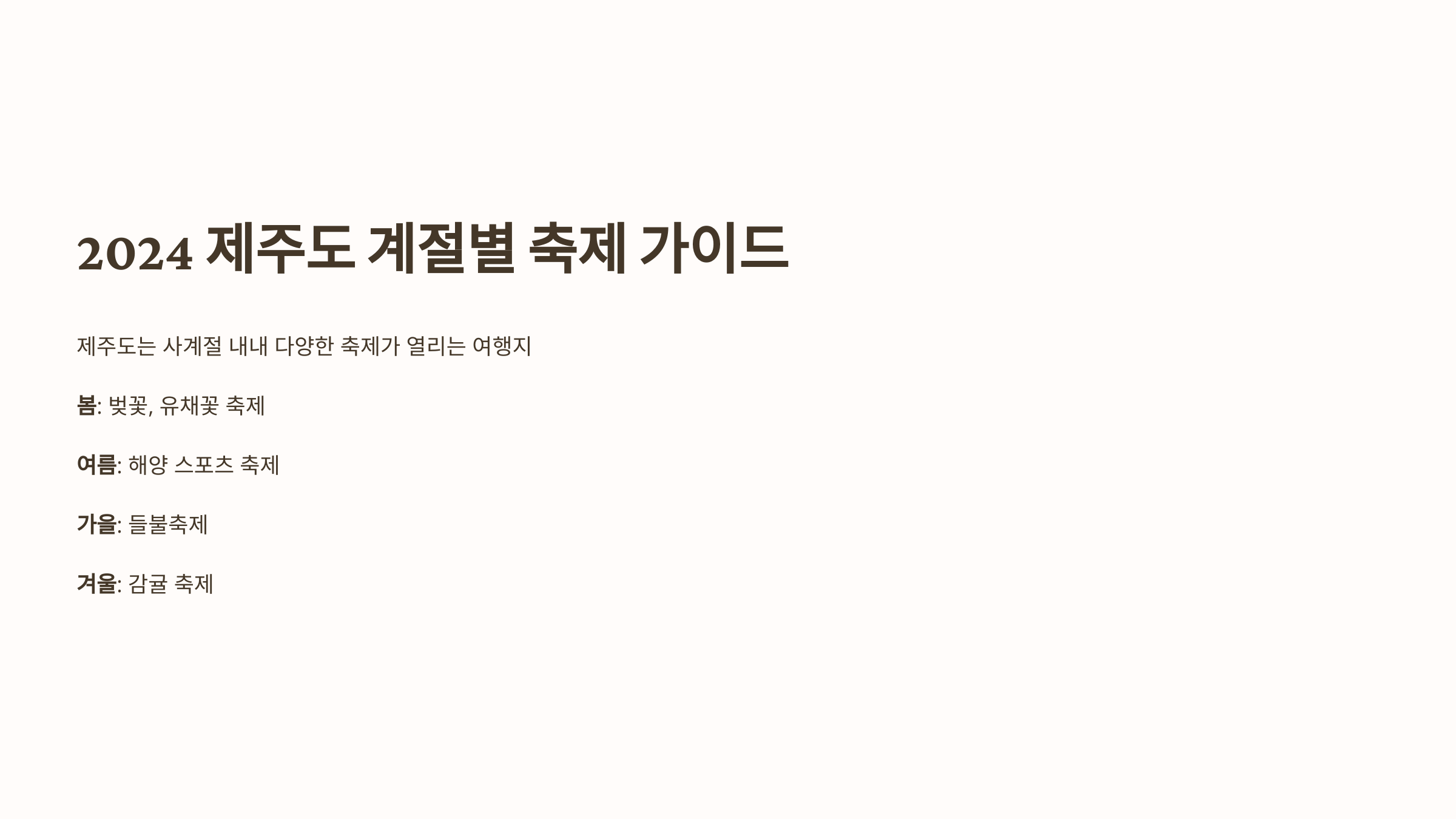 제주도는 사계절 내내 다양한 축제가 열리는 여행지다. **봄에는 벚꽃과 유채꽃 축제, 여름에는 해양 스포츠 축제, 가을에는 들불축제, 겨울에는 감귤 축제**가 열린다. 이번 글에서는 **2024년 제주도에서 개최되는 계절별 대표 축제 일정**을 정리했다. 제주 여행을 계획하고 있다면, 축제 일정을 참고하여 더욱 특별한 여행을 즐겨보자.